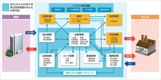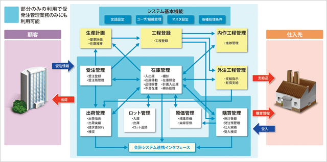 Có thể quản lý tồn kho của các nhà cung cấp với các kho được ủy thác・nhà thầu và lưu chuyển tồn kho trong nội bộ